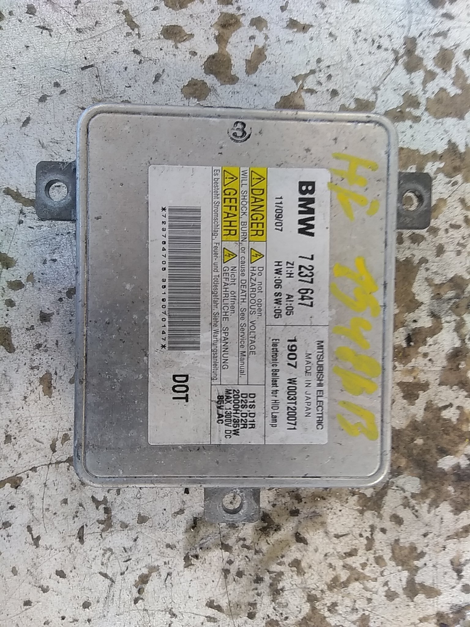 This Xenon / LED relay is designed for the BMW 5 Touring (F11) 530 d, ensuring compatibility with the vehicle's lighting system. The part is manufactured by BMW and carries the OEM number 63 11 7 318 327. It is positioned within the vehicle's electrical system, specifically for controlling the xenon or LED headlight functions. The relay is in good condition, classified as B1 quality, indicating it has been tested and functions as intended. The part is compatible with diesel engines, specifically the N57 D30 A engine code, and is suitable for vehicles with automatic or manual transmissions.